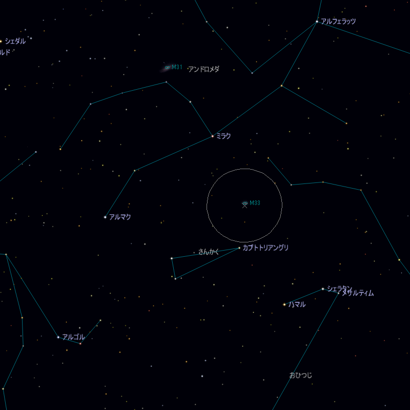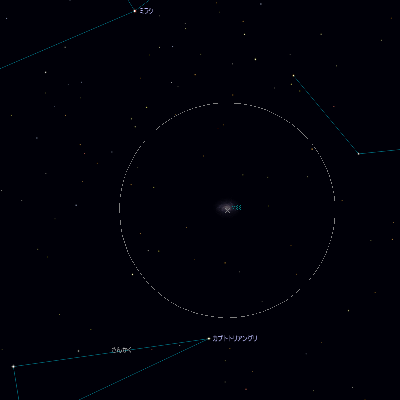 | 探し方 ミラクを挟んでM31と逆の方向ですが、双眼鏡だと その方法は曖昧すぎて判らないと思います さんかく座のα星 カプトトリアングリからアルフェラッツの方向に視野を3°ほど移動しますと6等星が見つかりますので、そこからミラクの方向に2°ほど視野を移動させますと、ぼんやりと広がったモヤのような物があれば それがM33です 正直、望遠鏡でその位置をファインダーで導入して答え合わせをして 始めて納得できると言うレベルの見え方です |