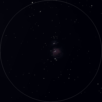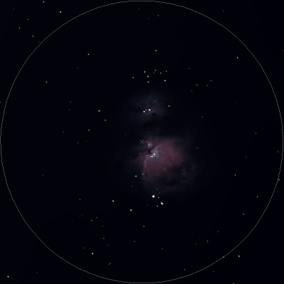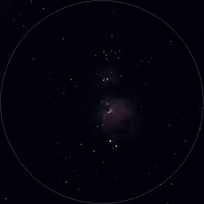 | 冬で一番目立つオリオン座の中にあるので、初心者さんは一番探しやすいのでは無いでしょうか 大きさも光度もあるので光害地でもまったく見えなくなるのは稀です ↓のイメージは赤紫っぽく色が付いてますが眼視では色は見えないと思ってください 光害地では縦方向の明るい部分だけが滲んだ棒状に見えるのみですが、暗いところに行くにしたがって、横方向に広がりを持って見えてくるようになります |