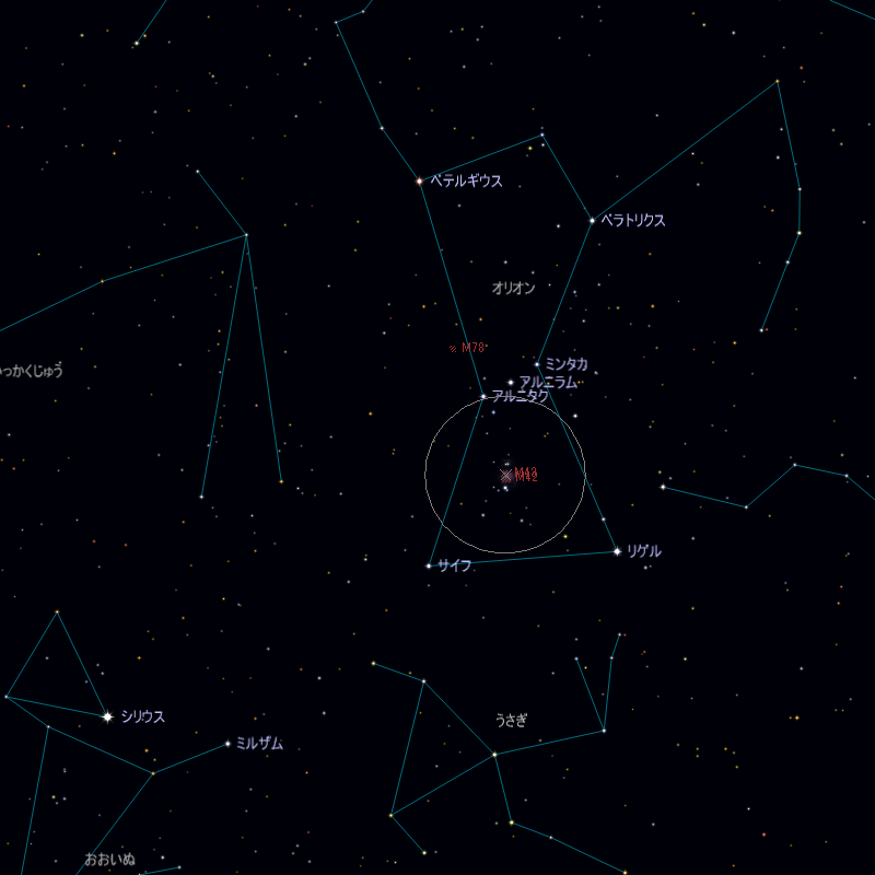 | 探し方 オリオン座の子三ツ星の真ん中を双眼鏡で見ると、ぼんやり滲んでいる姿が簡単に見つかると思います |