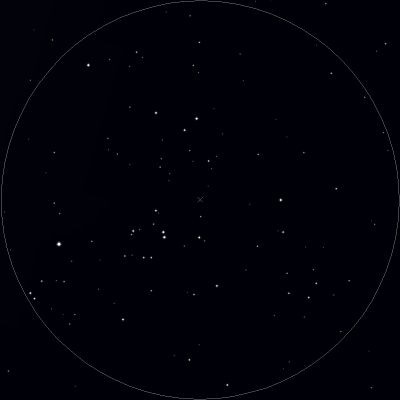 | おうし座の頭の部分にあたる大型の散開星団 視野内にアルデバランが見えますが、たまたま同じ方向にあるだけでMel.25の中にアルデバランは含まれて居ないそうです ガイドブック等にはアルファベットのVの字に見えると書いてあり、実際の夜空を双眼鏡で見ても確かにVの字型に並んで見えます ↓のイメージではVの字型にはちょっと見えないかな・・・ かなり明るい散開星団なので、光害地で月が在る日でも高度が在れば 明るい疎らな星星が見えます |