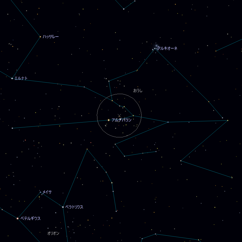 | 探し方 おうし座の右目にあたる一等星 アルデバランの周りを双眼鏡で見ると双眼鏡でも収まりきらない程の範囲に、まばらに星が沢山あるのが容易に確認できると思います |