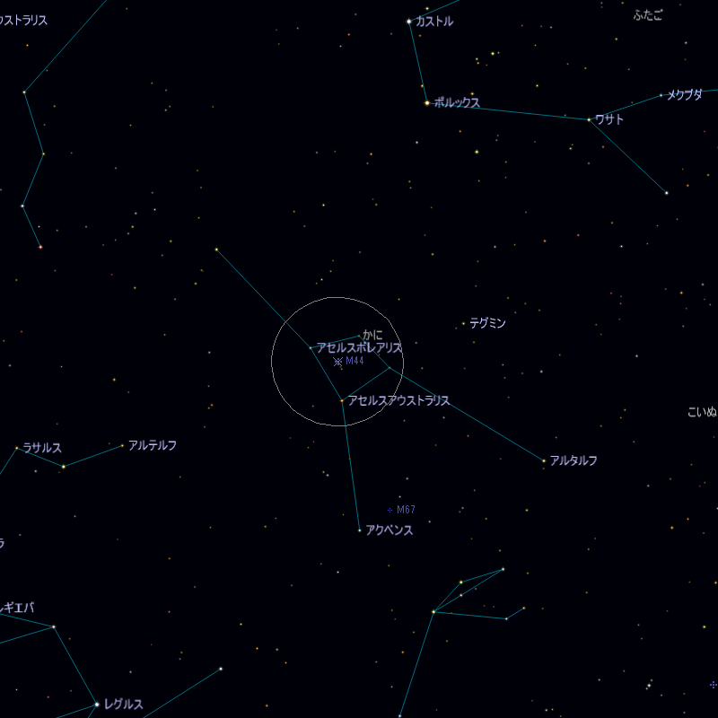 | 探し方 ふたご座のβ星 ポルックスと、しし座のα星 レグルスのちょうど中間にあります 大きな天体なのでその辺りを適当に双眼鏡で流していると見つかると思います 東から登ってくる時ですとポルックスから真下に双眼鏡を動かせば直ぐに見つかると思います |
