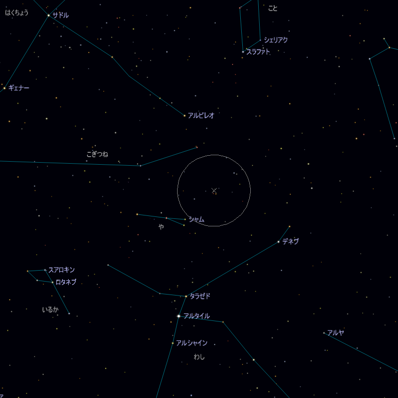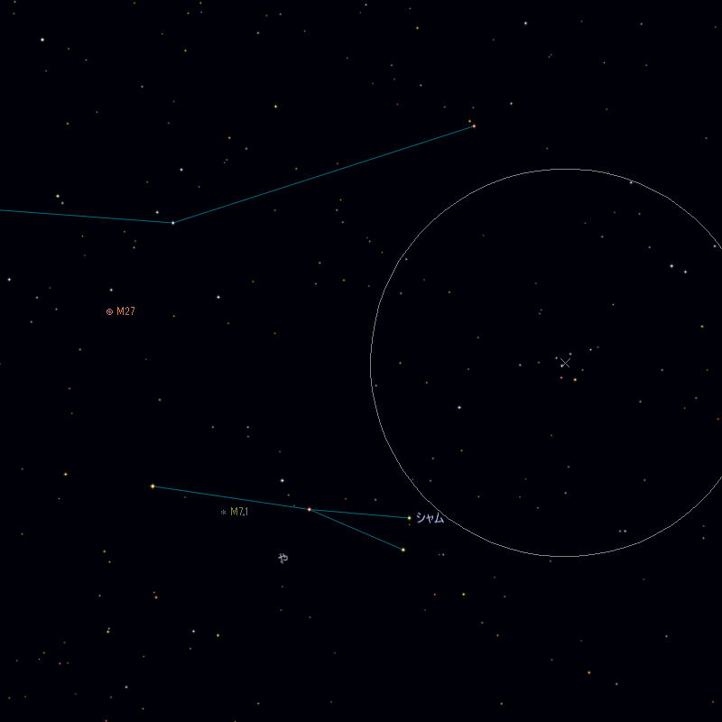| 探し方 わし座のアルタイルからタラセド方向に双眼鏡の視野、二つ分くらい行ったところに見つかります 予断ですが、望遠鏡でM71とM27を探すとき私はコートハンガーを見つけてから、ハンガーの直線を左方向に伸ばしたところに や座のγ星が見つかるので此処でM71を や座γ星を上方向に伸ばすと、こぎつね座のM文字が見つかるので、M文字の真ん中の角の星(こぎつね座14番星)の近くを探すとM27が見つかります |