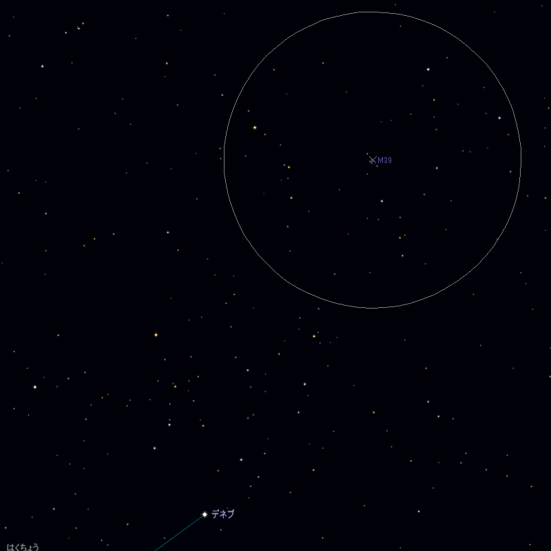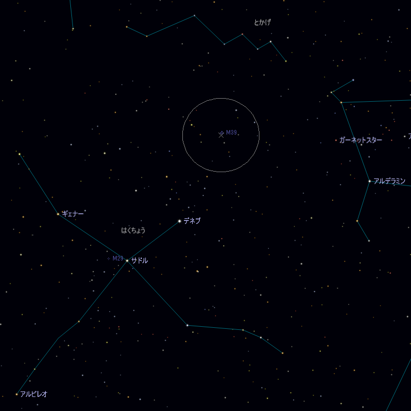 | M39 | タイプ:散開星団 | 直視径:32′ | 等級:4.6 |